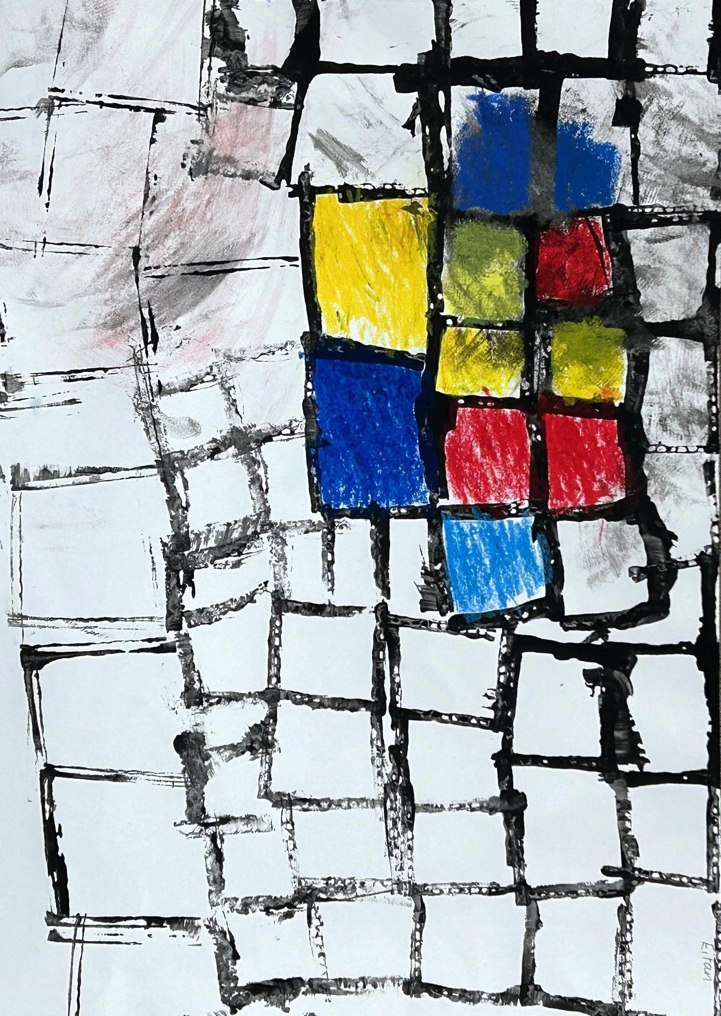 Eitan in Junior One, for some fantastic printmaking inspired by Piet Mondrian. Excellent use of line, shape and primary colours, well done Eitan!