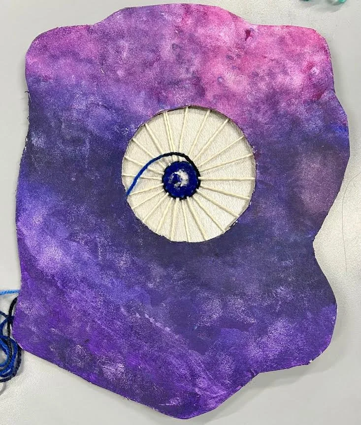 Lara in Form Six, for fantastic work inspired by Geodes. Brilliant use of paint techniques and an excellent start with circular weaving. Well done Lara!