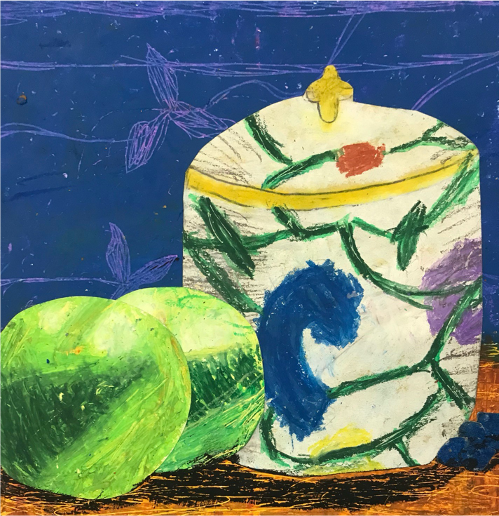 Ella in Form Five, for a fantastic still life inspired by the work of Paul Cezanne. Careful drawing and brilliant use of oil pastels, well done Ella!