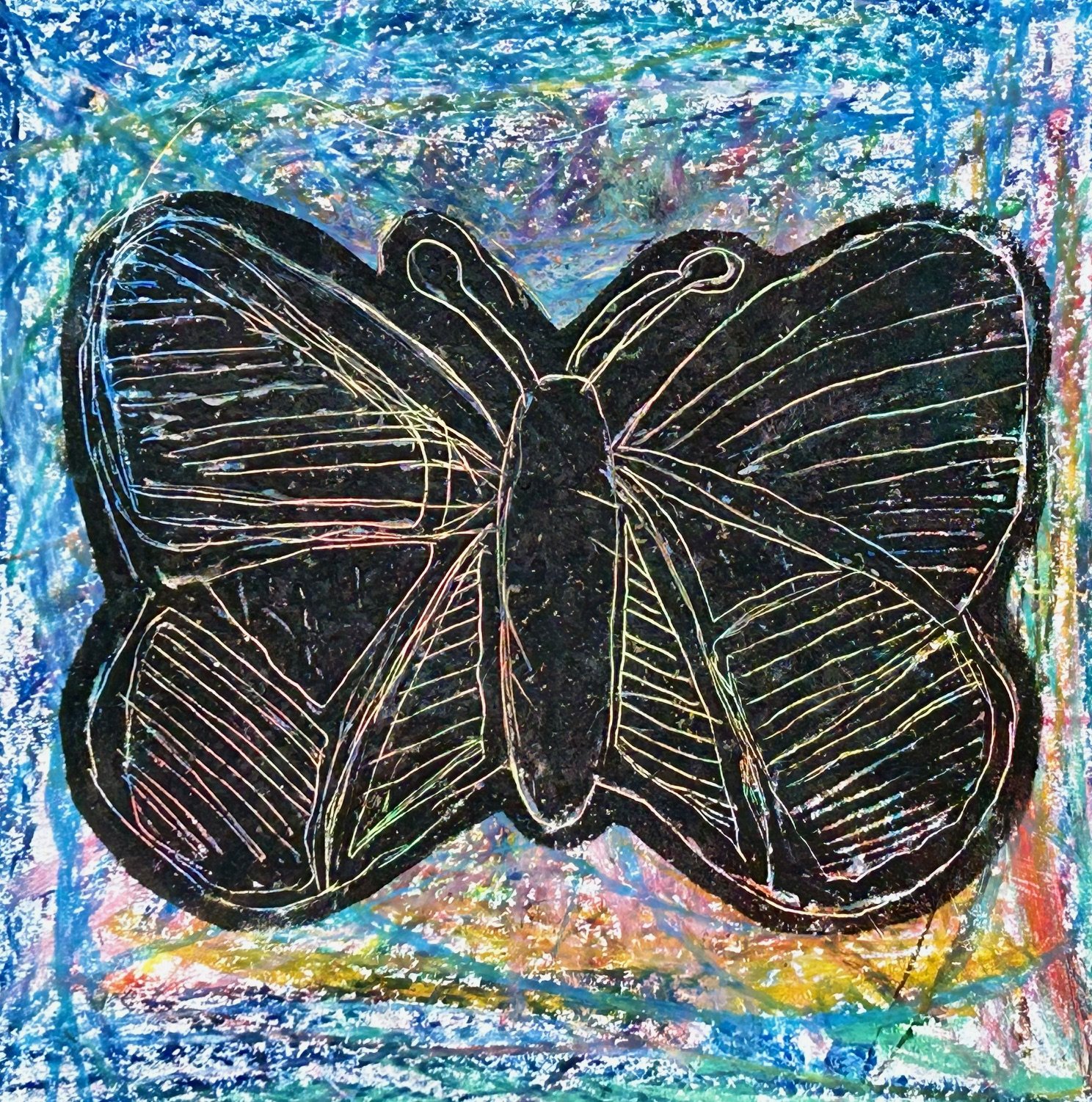 Emeer in Form Four, for some innovative printmaking. A fantastic relief-print butterfly on an expressive oil pastel background. Well done Emeer!