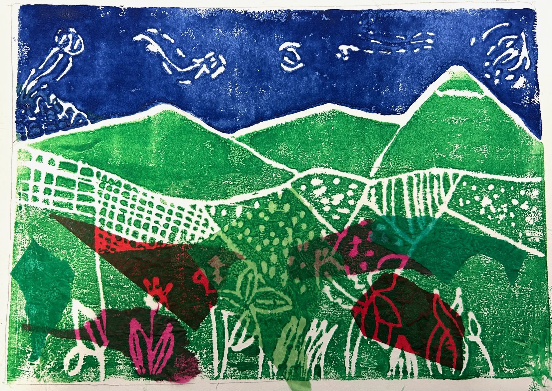 Mimi in Form Five, for a fantastic landscape print, inspired by the work of David Hockney. Careful printmaking and lots of hard work to create a very effective 2-part print block, well done Mimi!